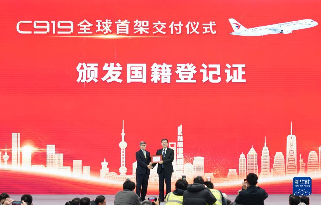 12月9日,在交付仪式现场,民航华东地区管理局向东航颁发国籍登记证。