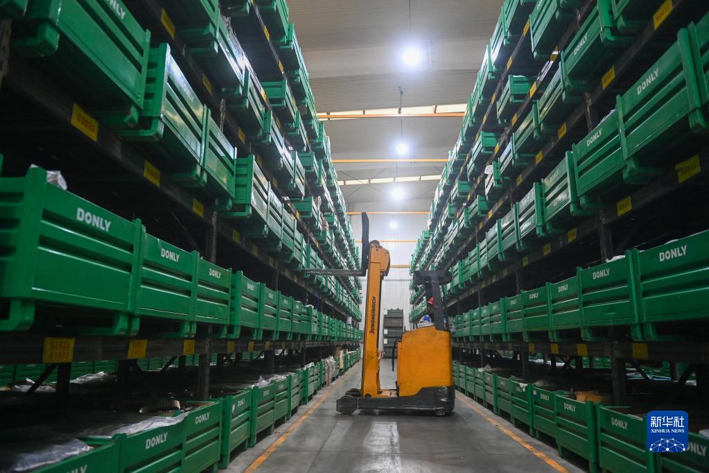 12月9日,叉车在宁波东力传动设备有限公司库房内装卸产品。