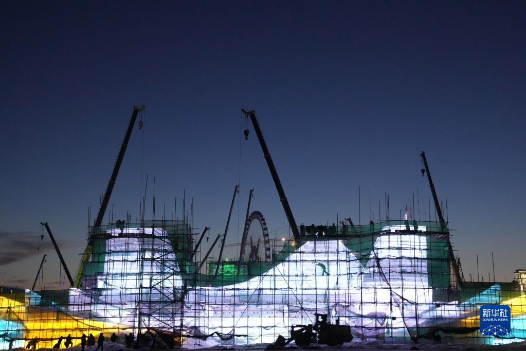 12月7日,工人在哈尔滨一处冰雪景观建设现场施工。