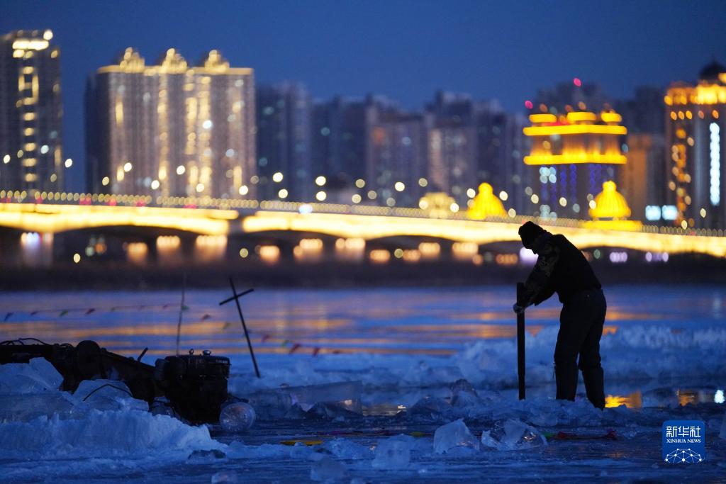 12月7日,工人在松花江哈尔滨段冰封的江面上进行采冰作业。