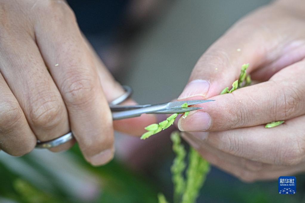 贺治洲在位于海南儋州的水稻试验基地对水稻育种材料进行人工去雄,为水稻杂交授粉做准备(11月2日摄)。新华社记者 蒲晓旭 摄