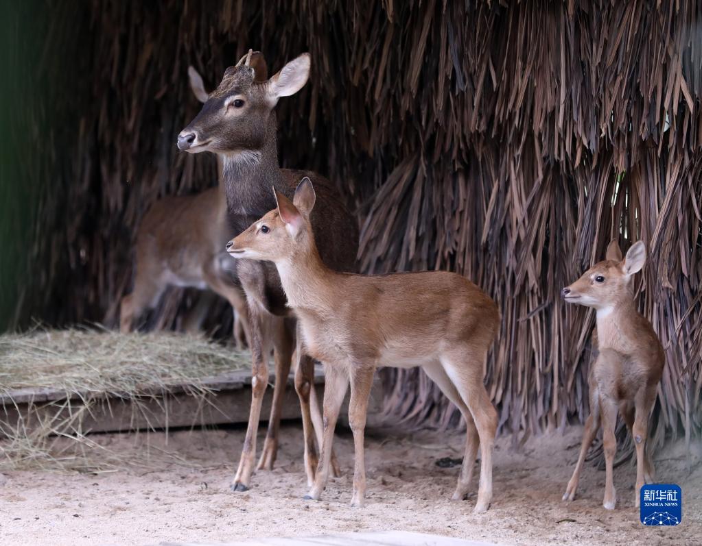 12月9日,两头海南坡鹿宝宝与成年坡鹿在一起。
