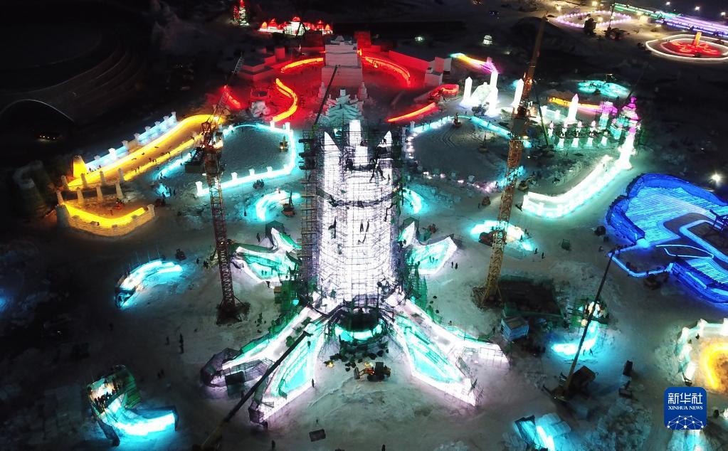 12月9日,哈尔滨冰雪大世界园区主塔“冰雪之冠”在进行灯光调试(无人机照片)。