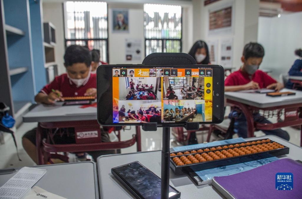 12月4日,在印度尼西亚万隆神墨教育学校,学生参与珠心算线上风采展示活动,手机屏幕显示的是全球其他活动现场。