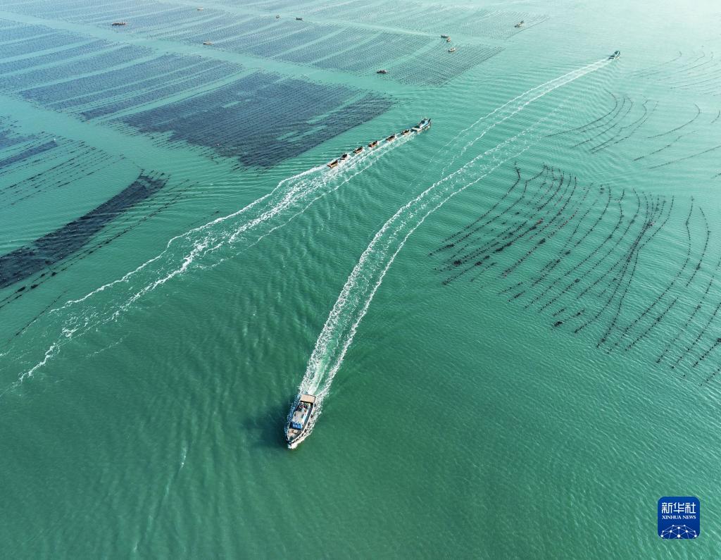 近日,在山东荣成市各大海洋牧场,养殖船来往穿梭,养殖工人在海上开展冬管、育苗等作业。