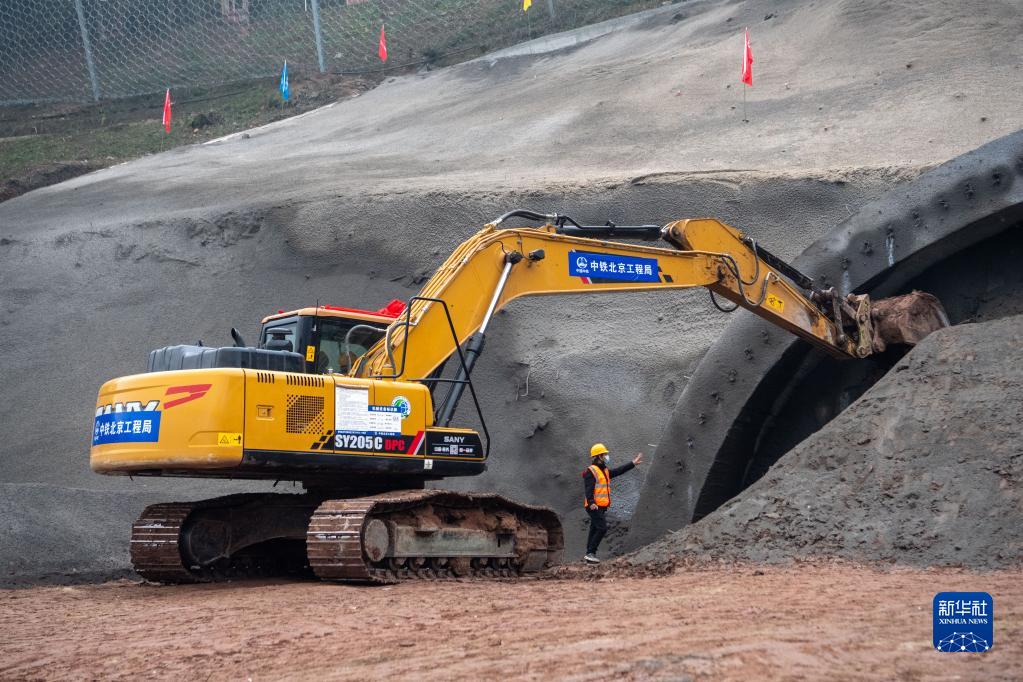 12月11日,工程机械在成达万高铁光明隧道施工现场作业。
