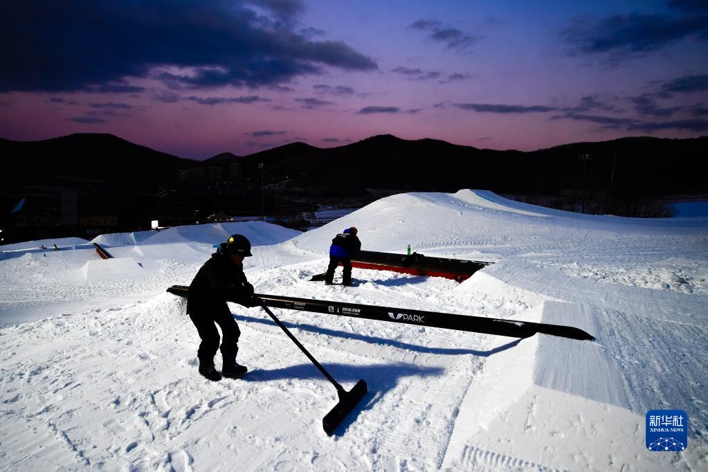 V-PARK地形公园团队成员在布置场地道具(12月9日摄)。