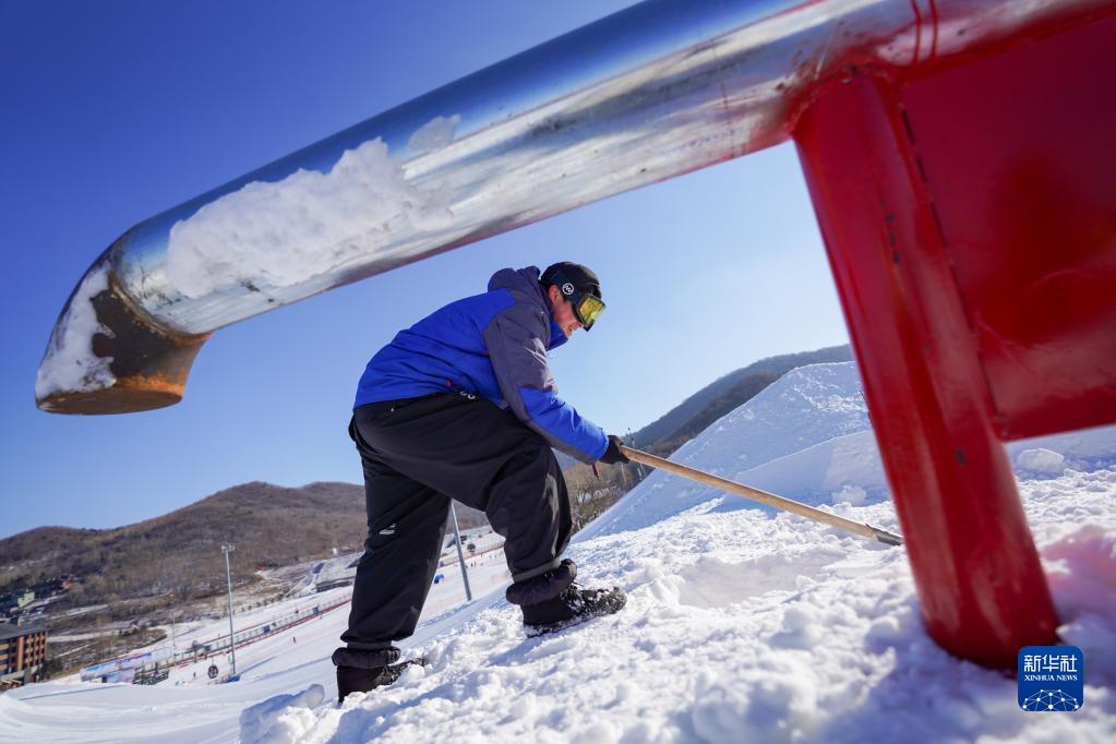 V-PARK地形公园团队成员在道具旁平整雪道(12月9日摄)。