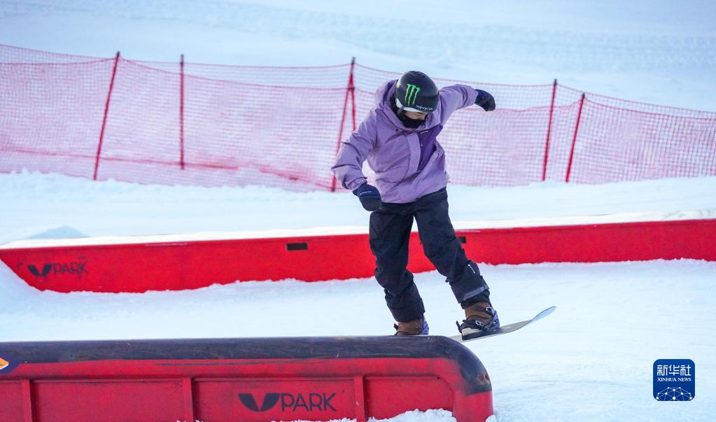 北京冬奥会单板滑雪男子大跳台冠军苏翊鸣在V-PARK地形公园挑战场地道具(12月10日摄)。