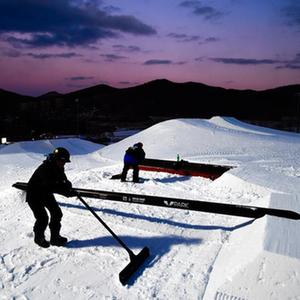 北京冬奥会单板滑雪男子大跳台冠军苏翊鸣在V-PARK地形公园挑战场地道具(12月10日摄)。