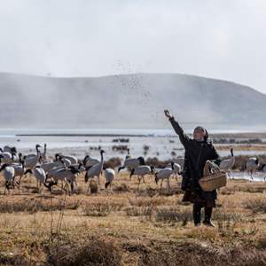 “九月九迎鹤来,三月三送鹤去”,清晨,伴随声声鹤唳,陈光会走上河堤,抛撒鹤粮,看着越来越多的黑颈鹤,虽寒风凛冽,却满心欢喜。