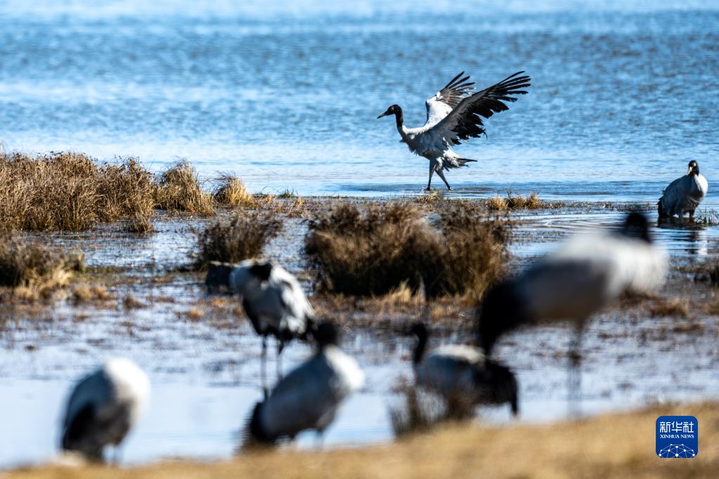 这是12月11日在云南大山包黑颈鹤国家级自然保护区内拍摄的黑颈鹤。
