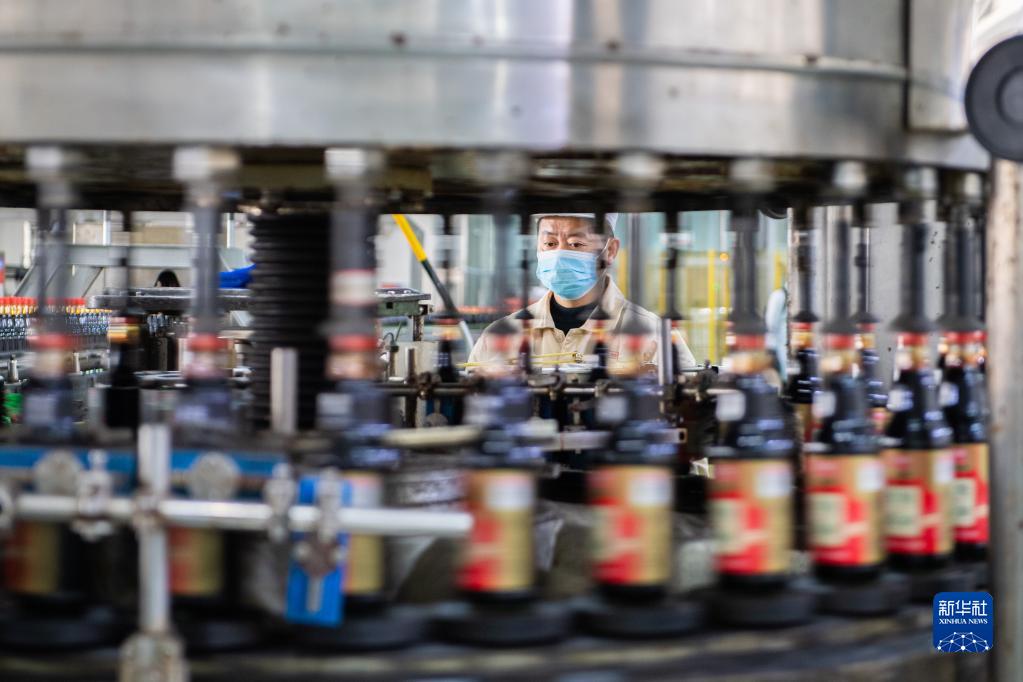 12月13日,在加加食品集团股份有限公司酱油生产车间,工作人员在检查酱油品质。