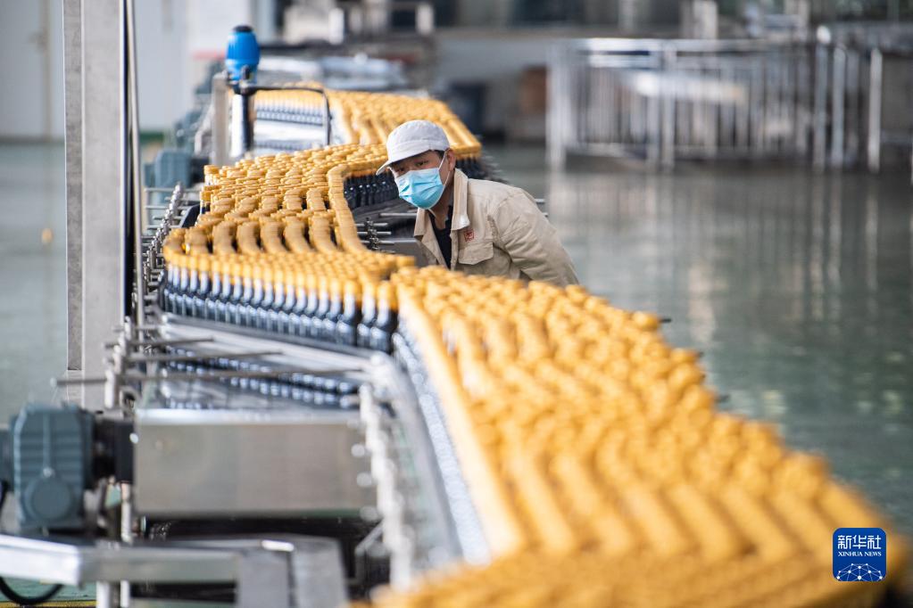 12月13日,在加加食品集团股份有限公司酱油生产车间,工作人员在检查酱油品质。