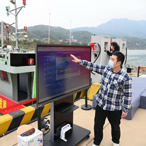 12月13日,工作人员在介绍同步上线运营的福建省电动船舶信息化平台。
