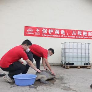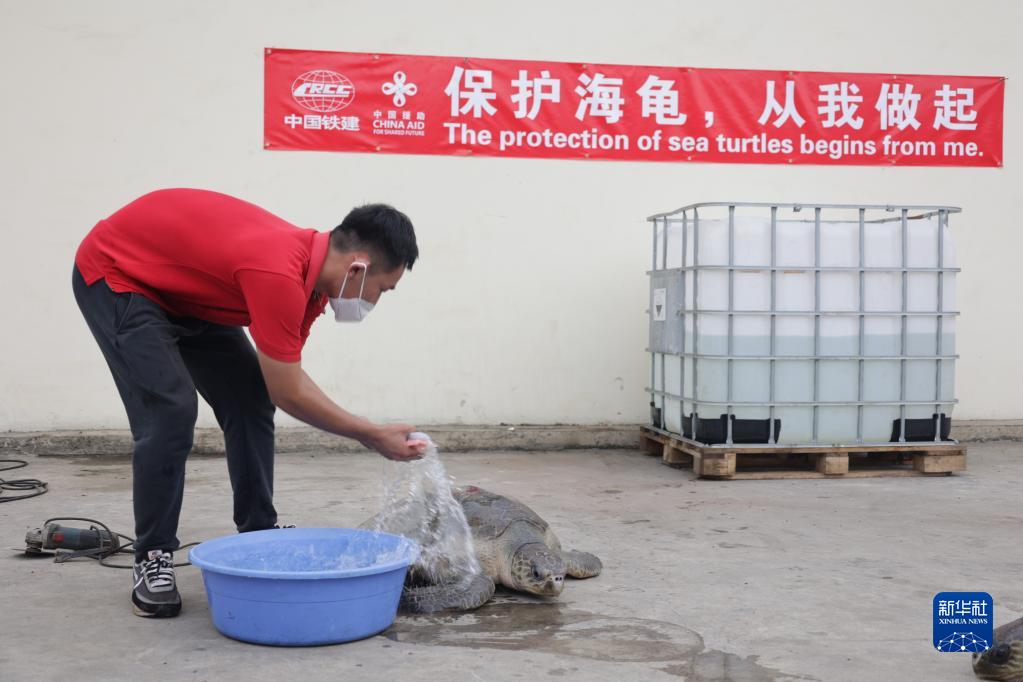 11月4日,工作人员在加纳首都阿克拉中国援建加纳渔港综合设施项目施工现场照料需要救助的海龟。