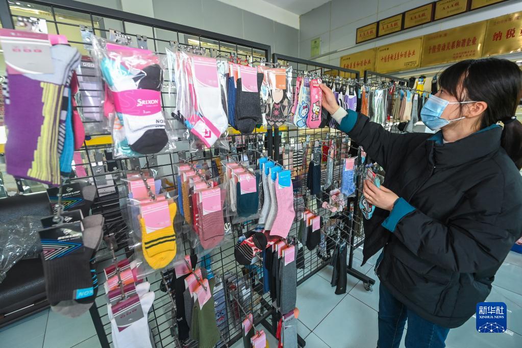 12月14日,在位于嘉兴市南湖智能装备制造产业生态园的嘉兴云翔针织有限公司展厅内,工作人员在整理一批待出口袜子的样品。该公司的负责人近期参加了包机赴日本参展活动,拿到了200多万美元的意向订单。