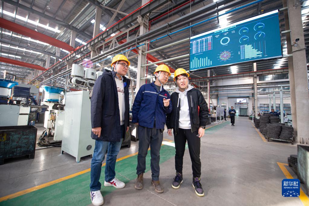 12月14日,浙江恒久传动科技股份有限公司负责人(中)在企业生产车间内与陶朱街道驻企指导员交流企业生产经营情况。