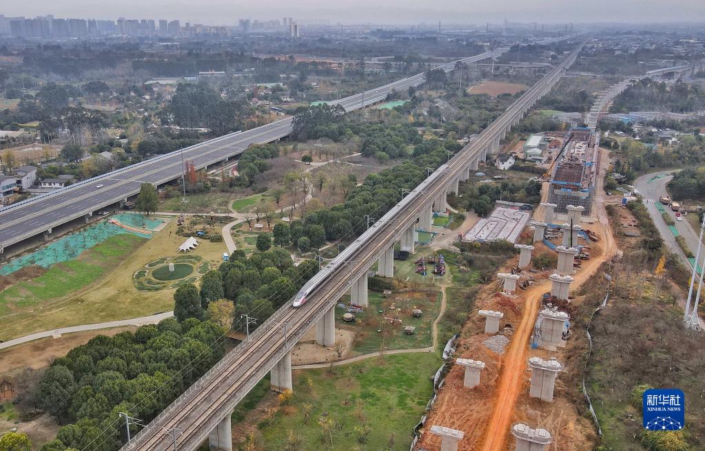 12月12日拍摄的成资渝高速公路(左)、成渝高铁(中)和正在修建的成自宜高速铁路(右)(无人机照片)。