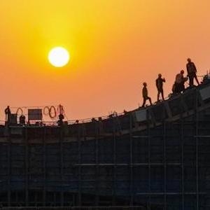 12月14日,工人在跨襄阳北编组站大桥T3主塔上施工(无人机照片)。