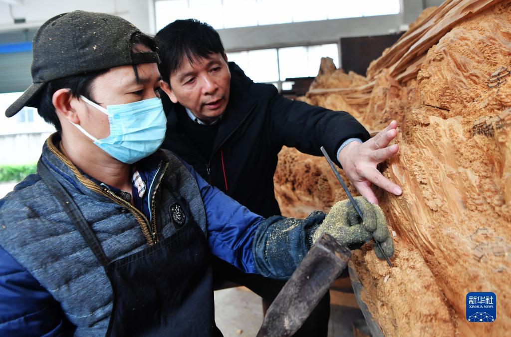 12月14日,国家级非遗项目莆田木雕省级代表性传承人郑春辉(右)在向员工传授雕刻技艺。