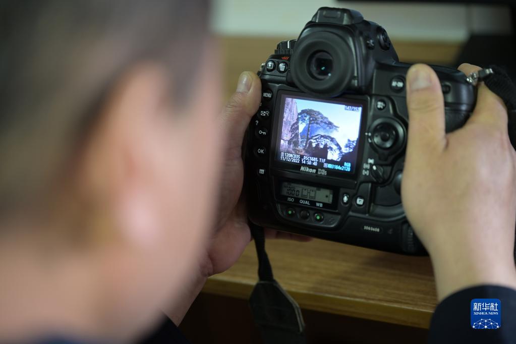 12月11日,胡晓春查看自己刚刚拍摄的迎客松照片。