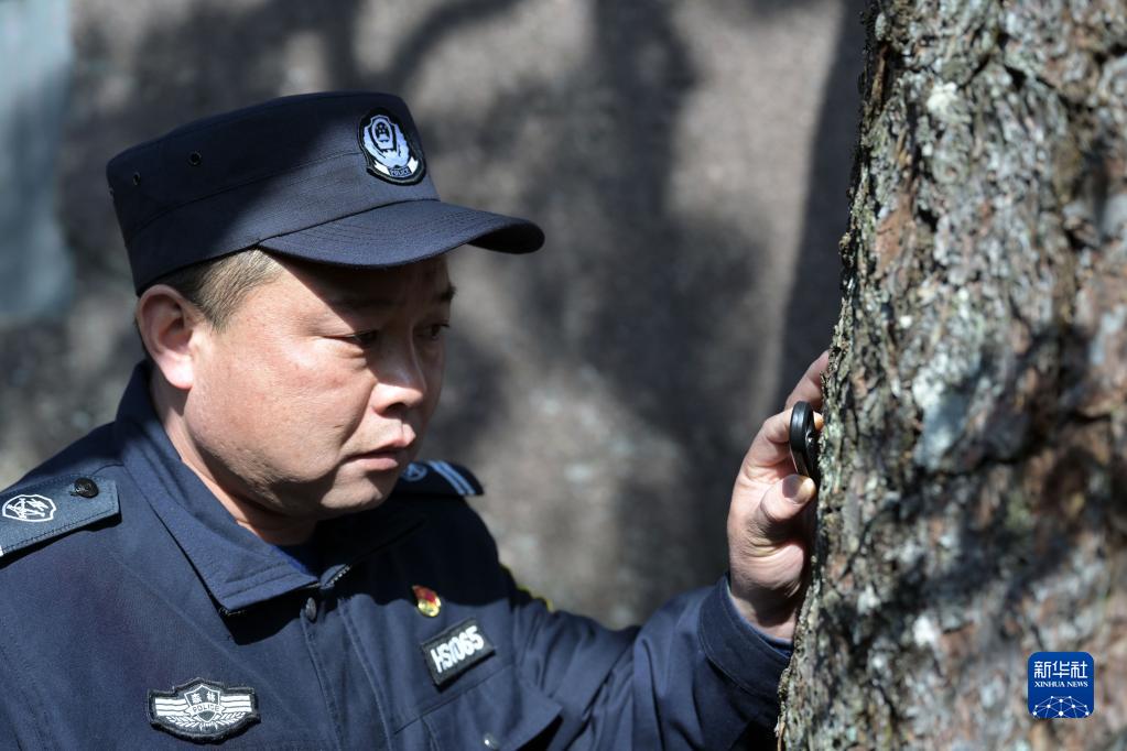 12月12日,胡晓春用放大镜检查迎客松的树皮和纹理,以便及时发现病虫害。