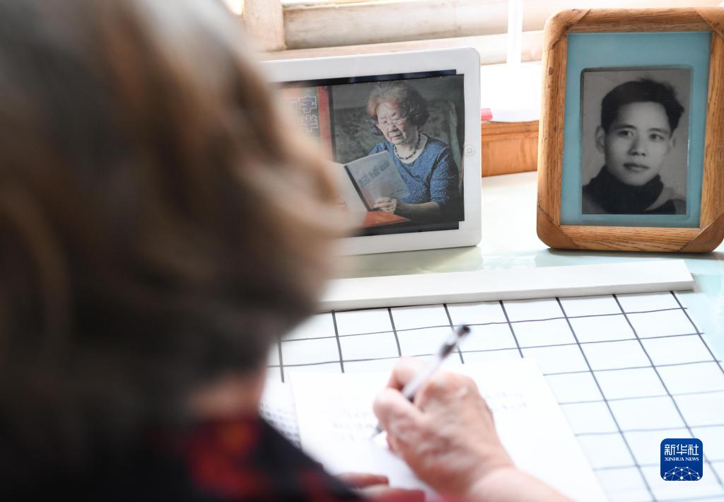 这是5月17日,在安徽省芜湖市,83岁的张爱兰老人在家中写作。书桌上摆放着她和去世37年的爱人徐国诚的照片。