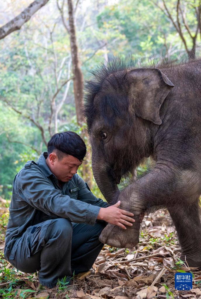 这是3月15日,在云南省西双版纳傣族自治州景洪市,云南亚洲象种源繁育及救助中心的“象爸爸”许云峰查看被救助幼象“龙龙”左前腿的恢复情况。