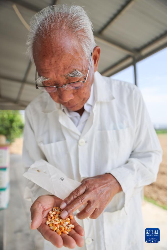 12月15日,玉米育种专家程相文在三亚南繁科研育种基地观察玉米种子。