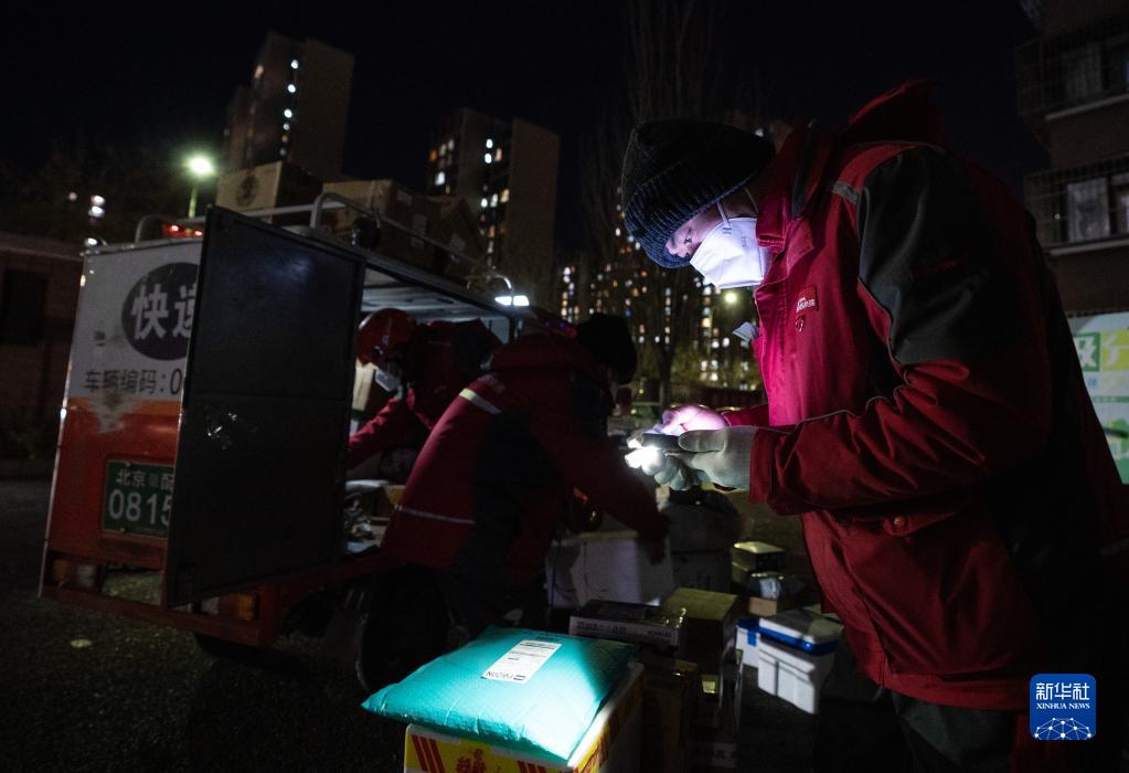 在北京市大兴区新源时代小区,从西安赴京支援的快递小哥王选军(前)、齐帅龙(后左)和高兴兴按照楼号分货(12月15日摄)。