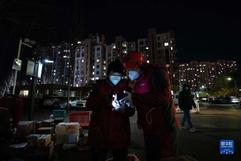 在北京市大兴区新源时代小区,从西安赴京支援的快递小哥齐帅龙(右)和高兴兴在核查配送信息(12月15日摄)。