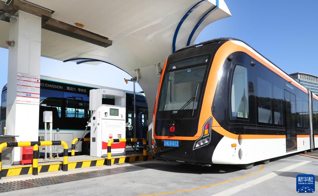 12月15日,一辆氢能中运量公交车驶入氢能公交车加气站加气。