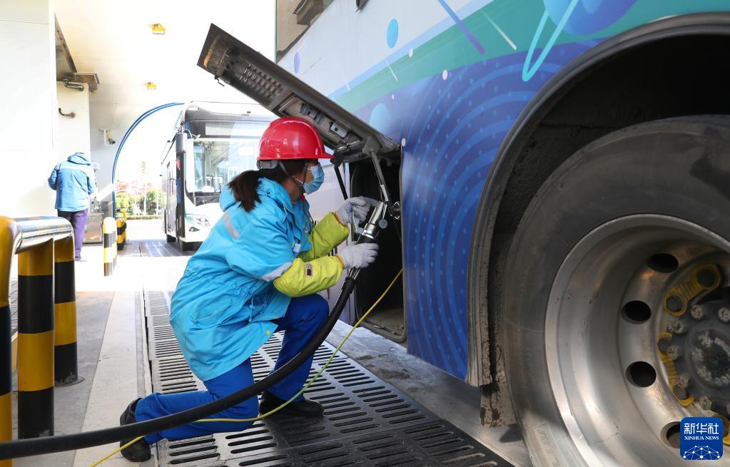 12月15日,一名工作人员在加气站内连接加气口,为氢能公交车加气。