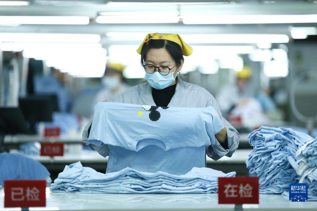 12月16日,青岛市即墨区一家服装企业的工人在检验准备出口到海外市场的产品。