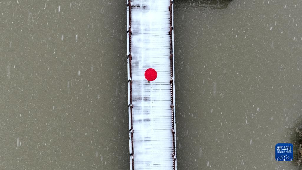 12月16日,游客在江苏省淮安市洪泽湖古堰景区赏雪(无人机照片)。