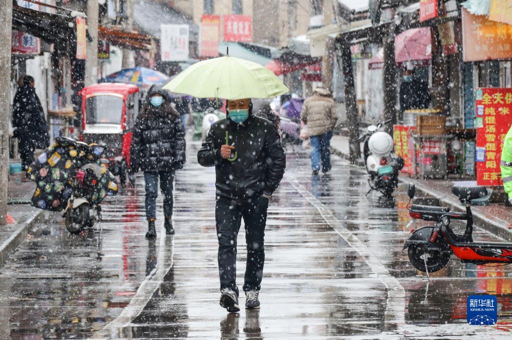 12月16日,江苏淮安市民在雨雪天气中出行。