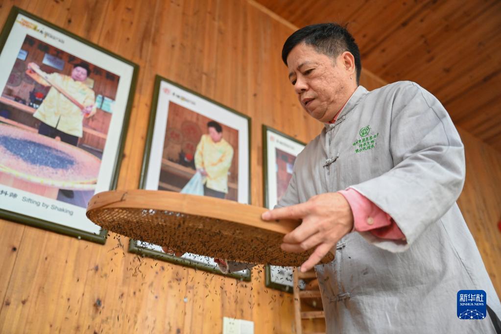 12月16日,在福州茉莉花茶制茶工坊,福州茉莉花茶传统窨制工艺大师傅天甫进行制茶的第二道工序“抖”。“抖”是将茶叶分出曲直圆扁。