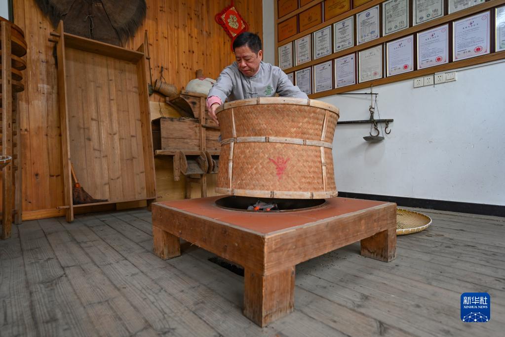 12月16日,在福州茉莉花茶制茶工坊,福州茉莉花茶传统窨制工艺大师傅天甫进行制茶的第五道工序“烘”。“烘”是将茶叶均匀摊放在竹制焙笼上进行烘焙。