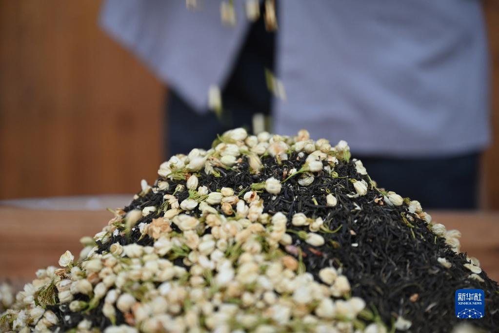12月16日,在福州茉莉花茶制茶工坊,福州茉莉花茶传统窨制工艺大师傅天甫进行制茶的第七道工序“提”。“提”是用少量优质茉莉花再复窨一次,主要为了增强花茶香气的鲜度。