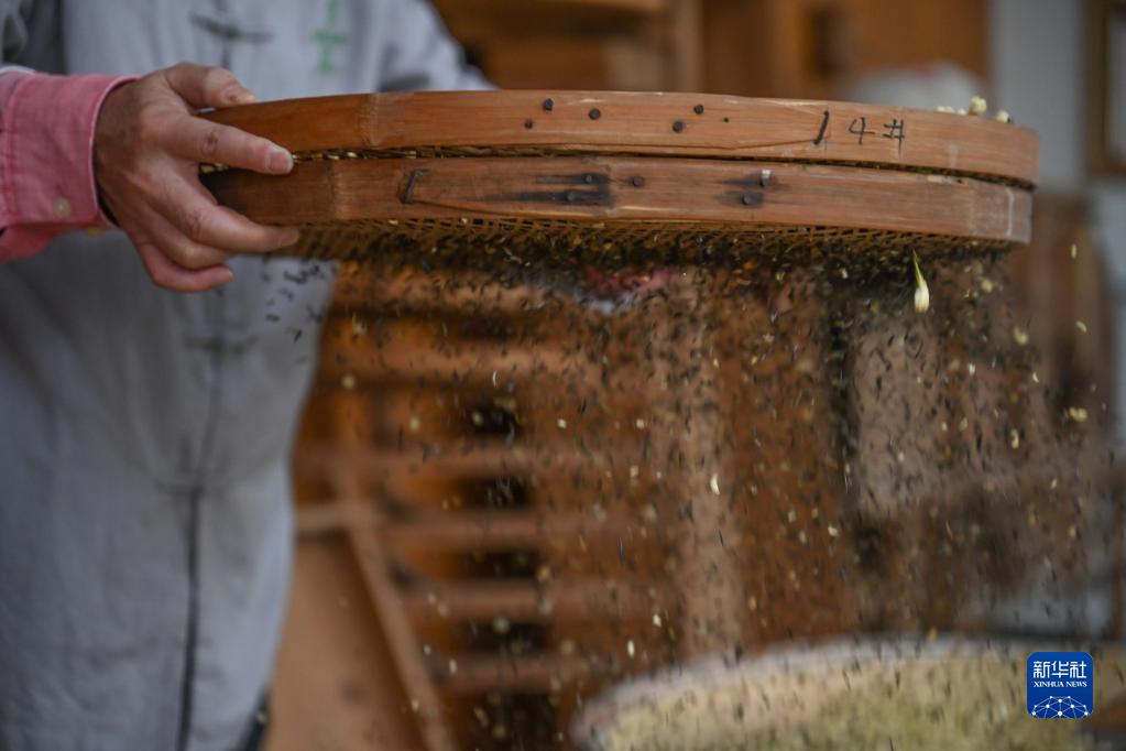 12月16日,在福州茉莉花茶制茶工坊,福州茉莉花茶传统窨制工艺大师傅天甫在筛茶。筛茶是把需要重复窨次的茉莉花茶中的花和茶叶分离。