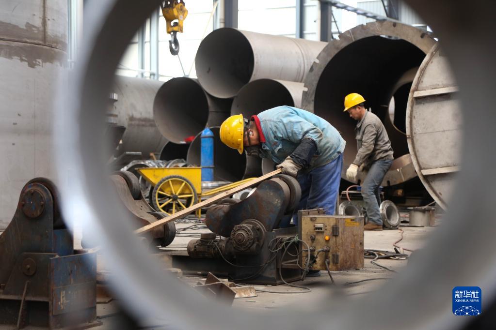 12月17日,工人在贵州省黔南布依族苗族自治州福泉市一家新型材料制造企业检修压力容器加工设备。