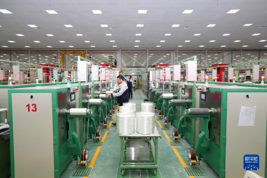 12月15日,在位于埃及苏伊士省的中国巨石埃及玻璃纤维股份有限公司(巨石埃及公司),工人在玻璃纤维生产线上工作。