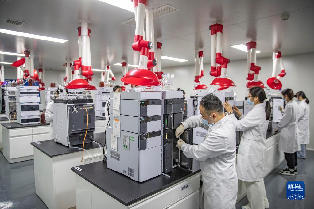 12月16日,在重庆市永川区新领先(重庆)生物医药一体化研发服务基地,新领先重庆研究院的研发人员在液相区对样本进行色谱分析。