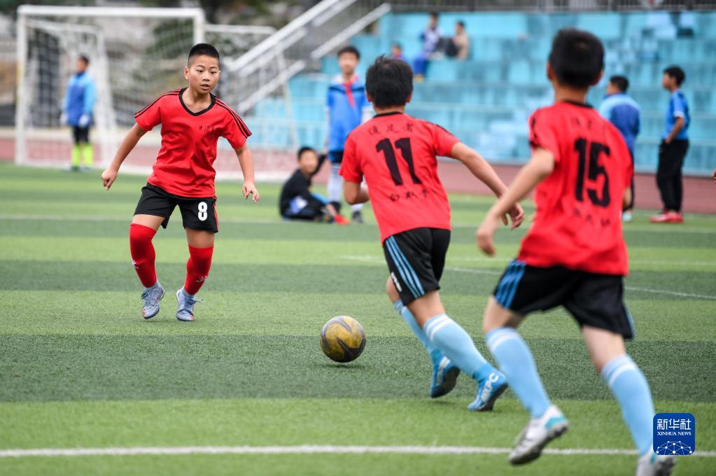 在贵州省丹寨县城关第一小学,金粲璨(左)参加校园足球比赛(11月15日摄)。