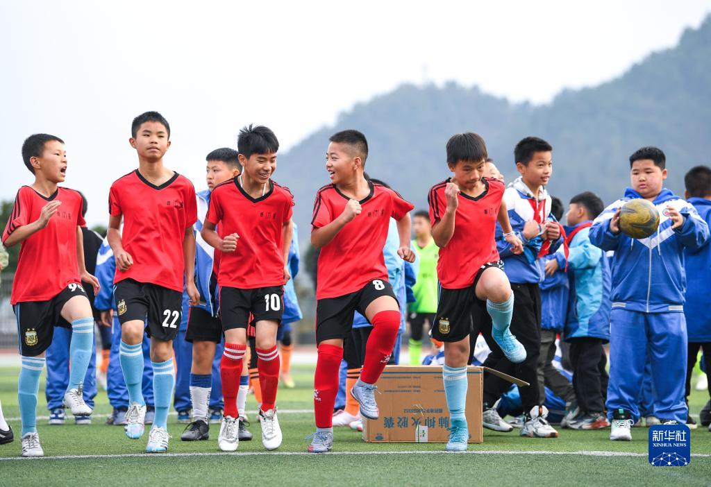 在贵州省丹寨县城关第一小学,金粲璨(前排左四)与同学们在校园足球比赛前热身(11月15日摄)。