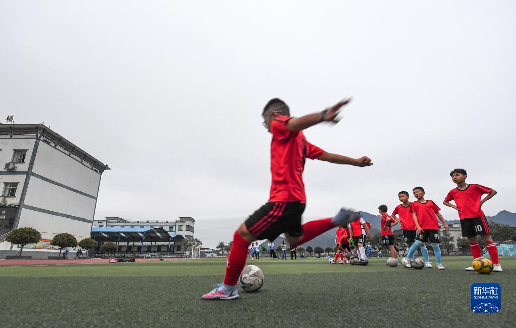在贵州省丹寨县城关第一小学,金粲璨(前)在参加足球基本功训练时练习点球(11月15日摄)。