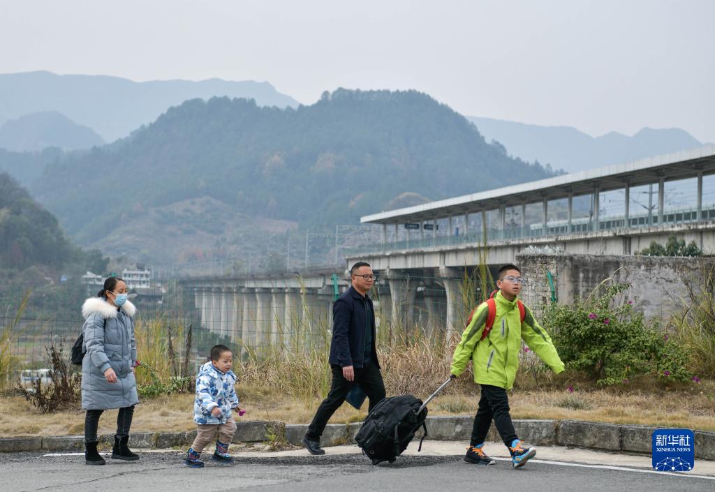 金粲璨(右一)在家人的陪同下前往贵州三都站转高铁出行(12月13日摄)。