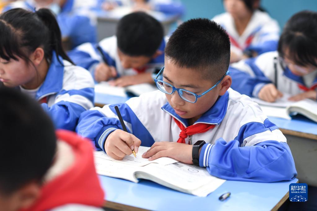 在贵州省丹寨县城关第一小学,金粲璨(前右)在课堂上学习(11月15日摄)。
