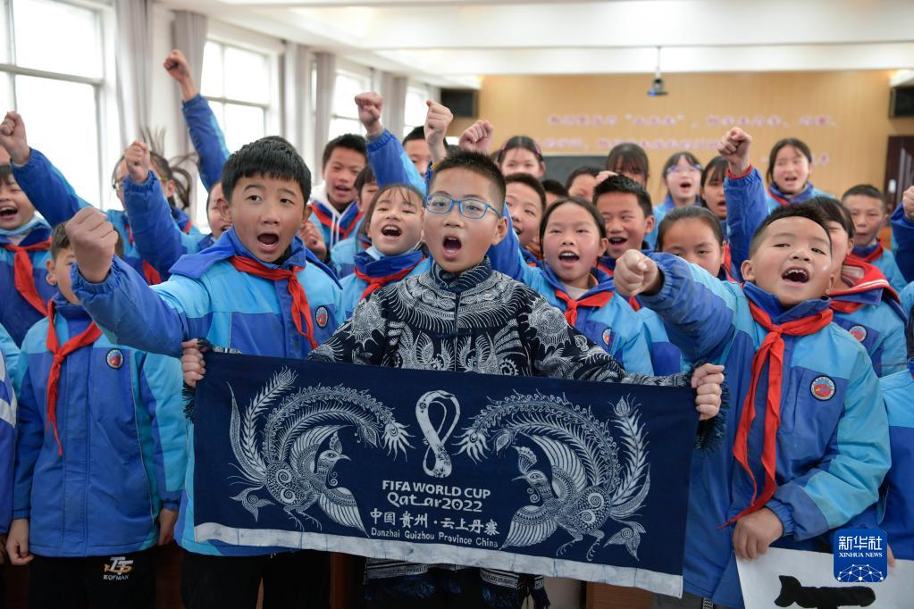 在贵州省丹寨县城关第一小学,同学们给临行前的金粲璨(前排右二)加油鼓劲(12月13日摄)。
